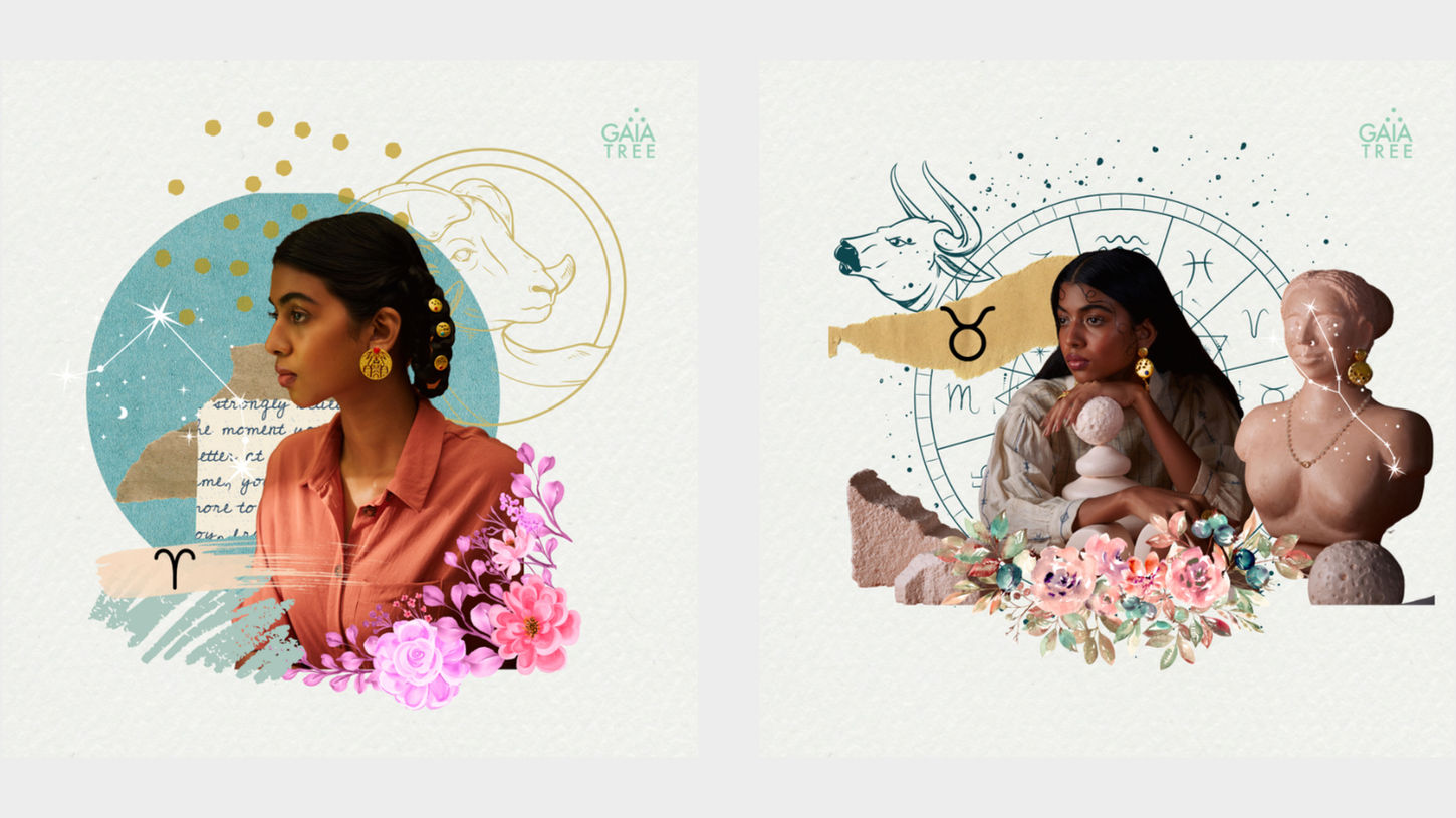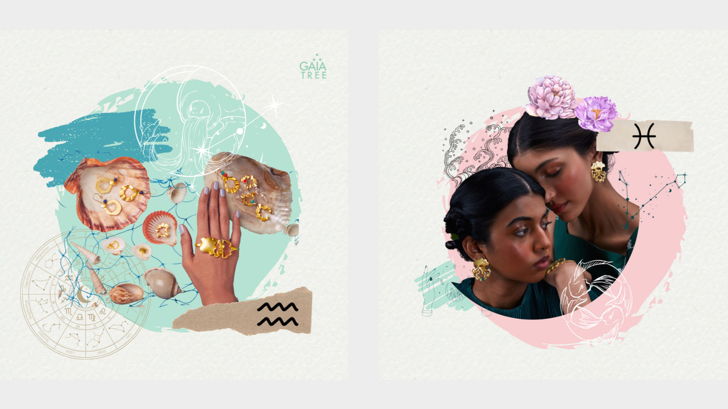 This collaboration blends zodiac signs with Gaia Tree's jewelry, creating striking collages that connect astrology with style. A collection lookbook was also designed, reflecting the brand's colors and aesthetic.